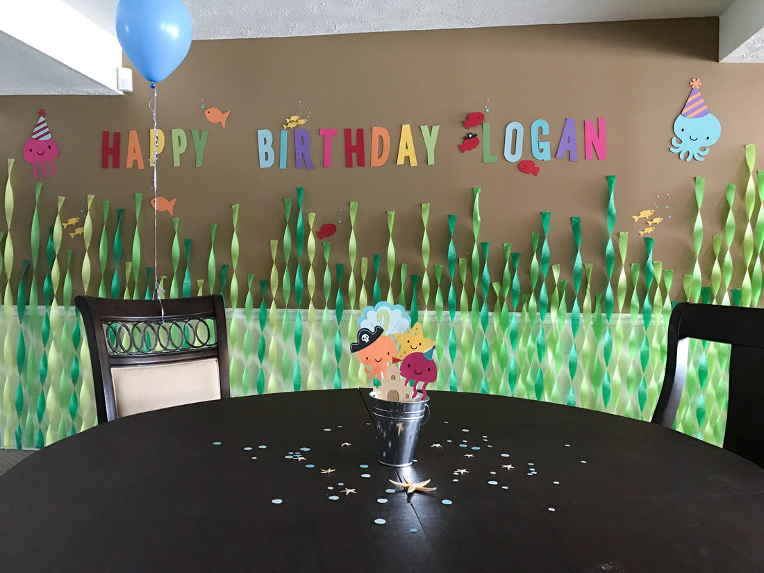 Once you have all your die cuts made, you can use them to create the different decorative elements of your party. I used my die cuts to create an invitation, garland, some bucket centerpieces, and an underwater scene on a large wall.