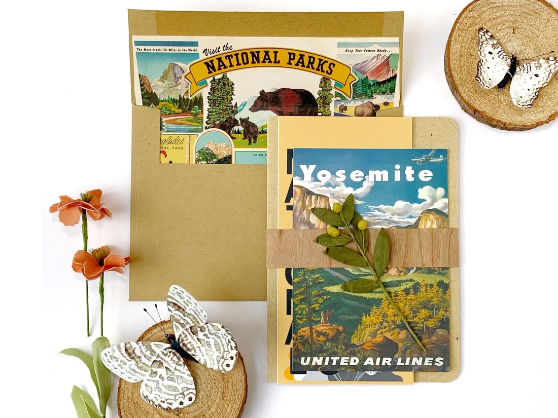 Let’s talk about the envelopes first. I used an A7 sized Paper Bag Kraft envelope. I wanted to line it with something, so I looked on Etsy for something national park themed and found this digital of a vintage national park poster. I sized it to 7” wide and trimmed it so it would fit inside the envelope. Then I adhered it to the envelope with some adhesive.