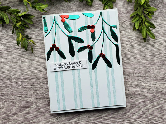 Mistletoe Mirror Paper Holiday Card November 01, 2019 Brighten someone's holiday season with this lovely card using Green and Red Mirror Paper and seasonal stamps and dies.
