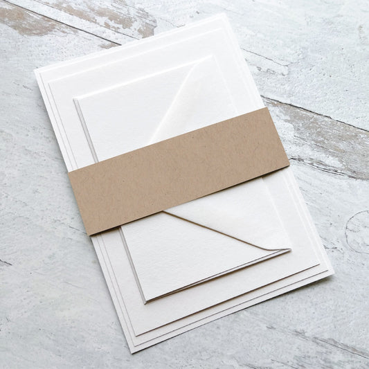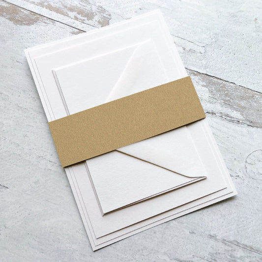 A popular choice for wedding cardstock paper, these Kraft cardstock belly bands have an antique vellum finish that lend a tactile quality while still being relatively smooth. From sophistication to a natural earthy appeal, Kraft belly bands make a beautiful presentation when wrapped around your wedding invitation suite, and these papers are sturdy enough to hold wax seals and other types of embellishments.