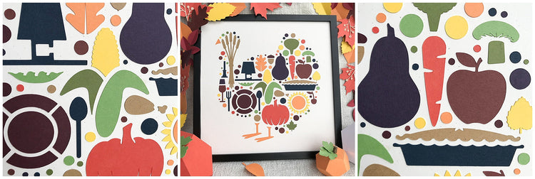 Once you have your turkey assembled, you can frame it in a 12x12 frame. We left the glass out to really show off the dimension in the die cuts! You could also add foam pop dots behind certain pieces to make the icons pop off of the page. Pair your art piece with our Fall Leaf Garland and Geometic Pumpkins for the perfect Thanksgiving decor!